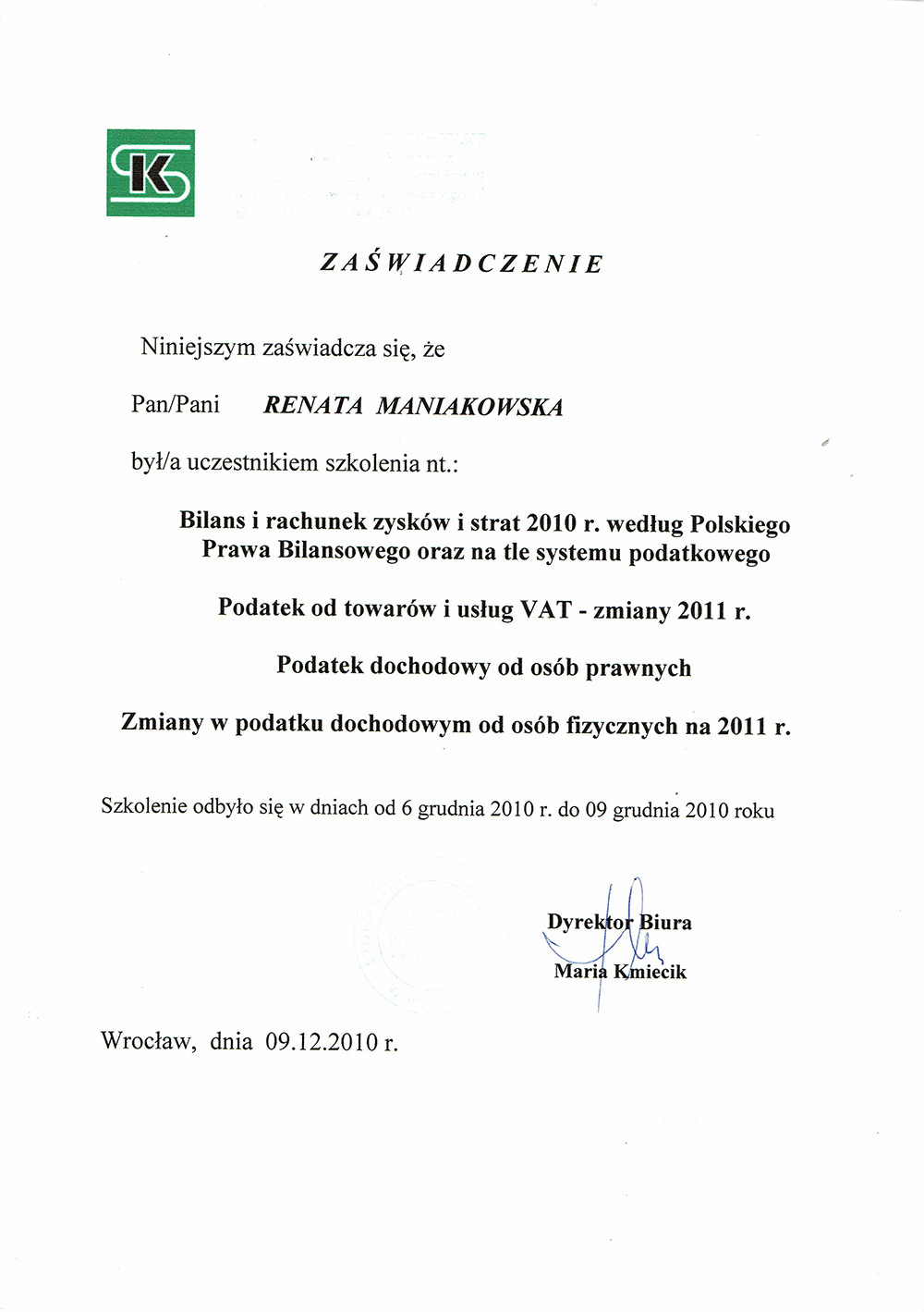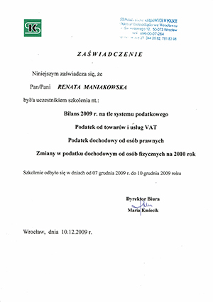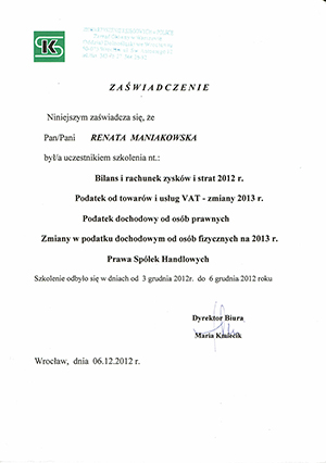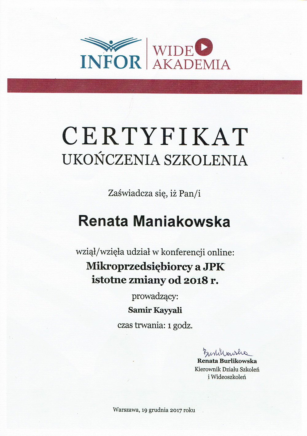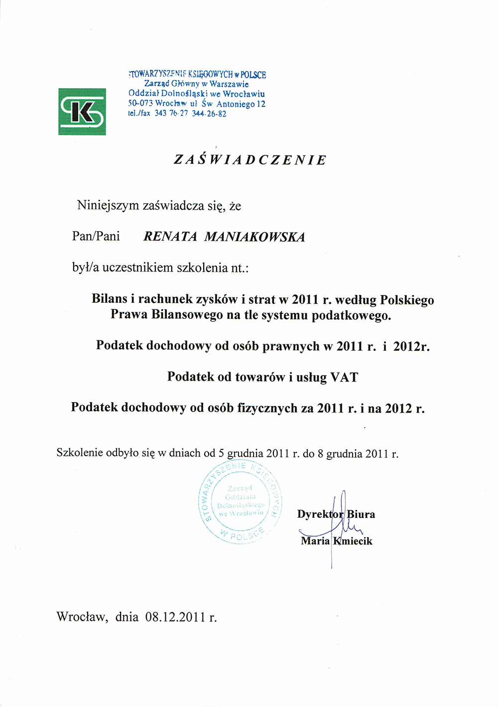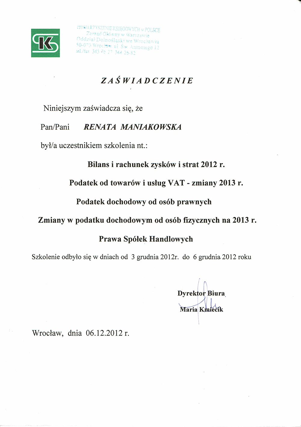 Firma Biuro Rachunkowe "ROK" Renata Maniakowska posiada wszelkie niezbędne certyfikaty i uprawnienia do prowadzenia działalności z zakresu księgowość nysa. Powyżej prezentujemy część z tych dokumentów. Przypominamy, iż bardzo ważne jest, aby sprawdzić uprawnienai i certyfikaty księgowego z którego usług mają Państwo zamiar skorzystać. Dokumenty te zwiększają wiarygodność usługodawcy z zakresu księgowość nysa. Zapraszamy do współpracy.