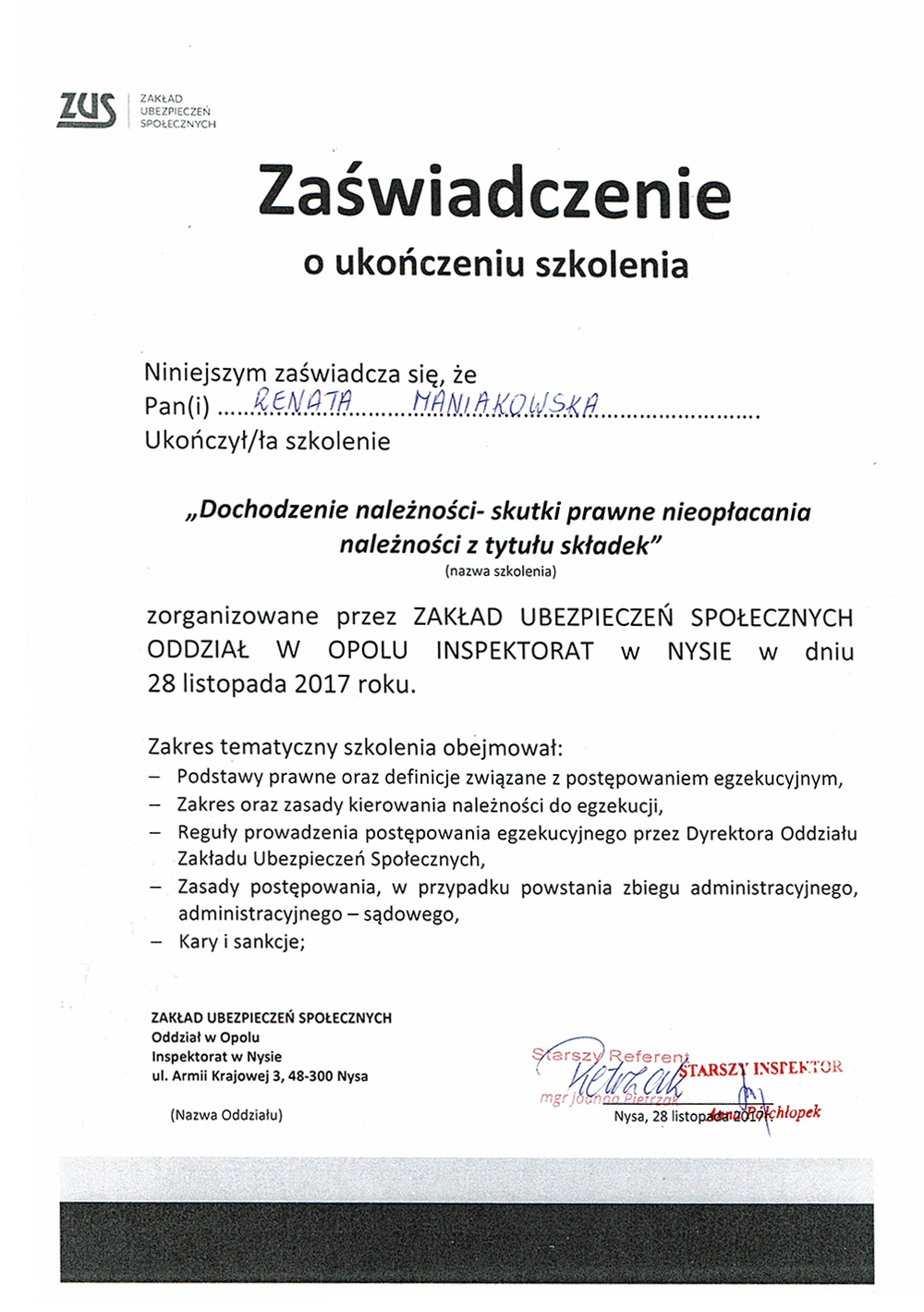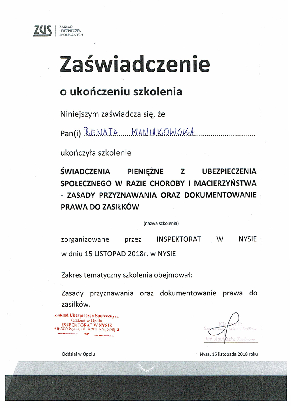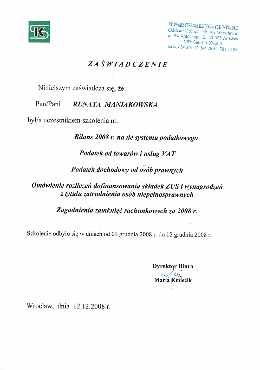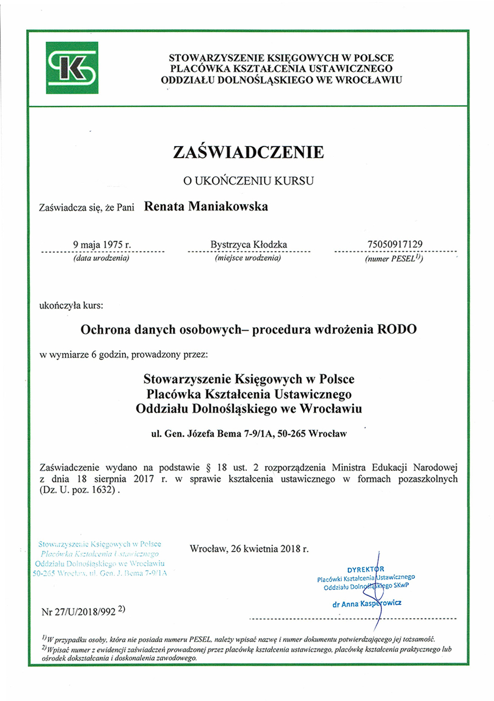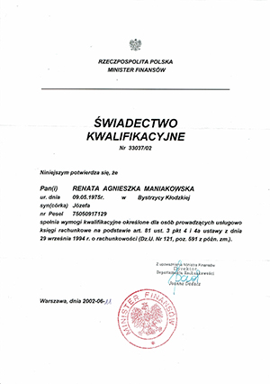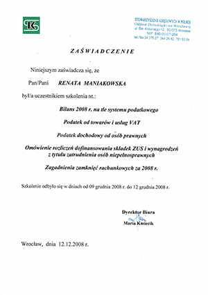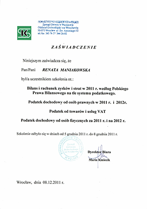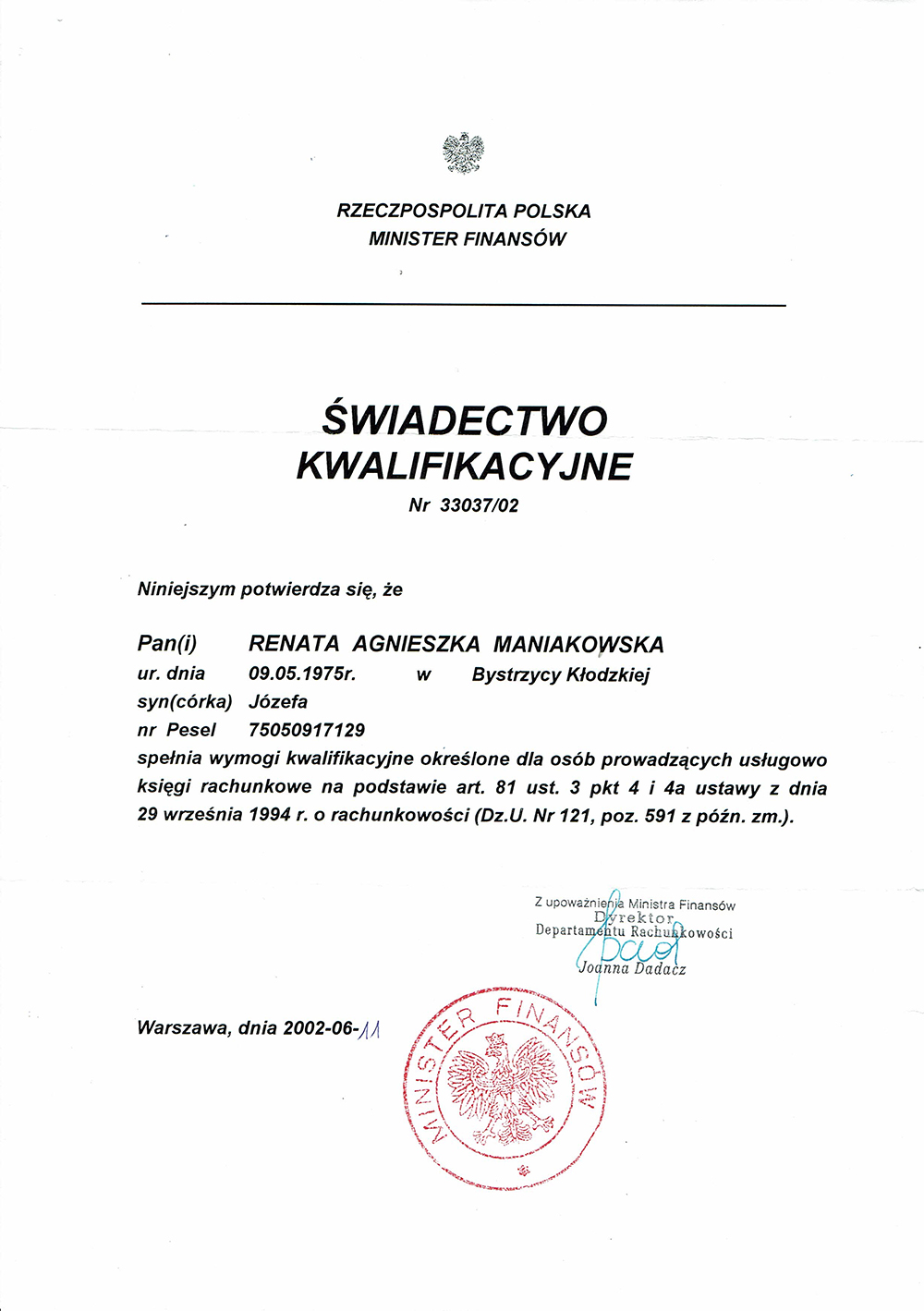 Firma Biuro Rachunkowe "ROK" Renata Maniakowska posiada wszelkie niezbędne certyfikaty i uprawnienia do prowadzenia działalności z zakresu księgowość nysa. Powyżej prezentujemy część z tych dokumentów. Przypominamy, iż bardzo ważne jest, aby sprawdzić uprawnienai i certyfikaty księgowego z którego usług mają Państwo zamiar skorzystać. Dokumenty te zwiększają wiarygodność usługodawcy z zakresu księgowość nysa. Zapraszamy do współpracy.